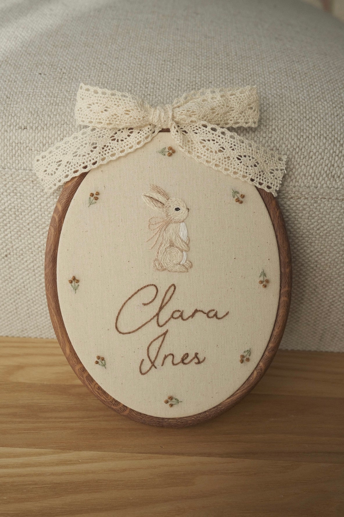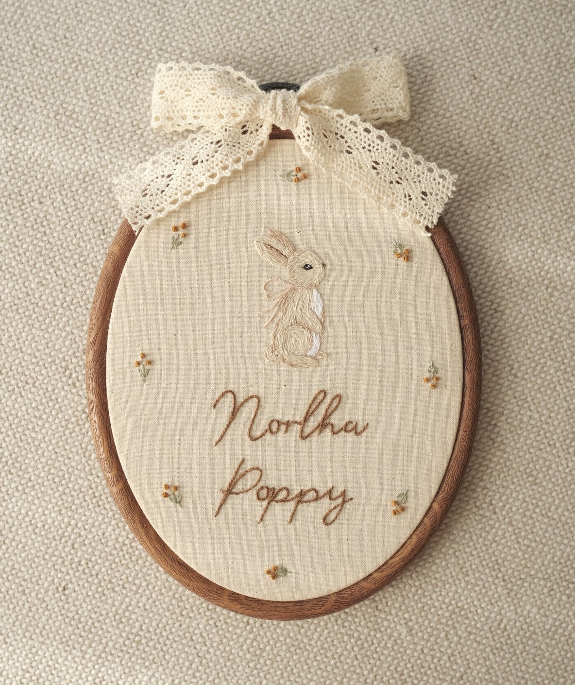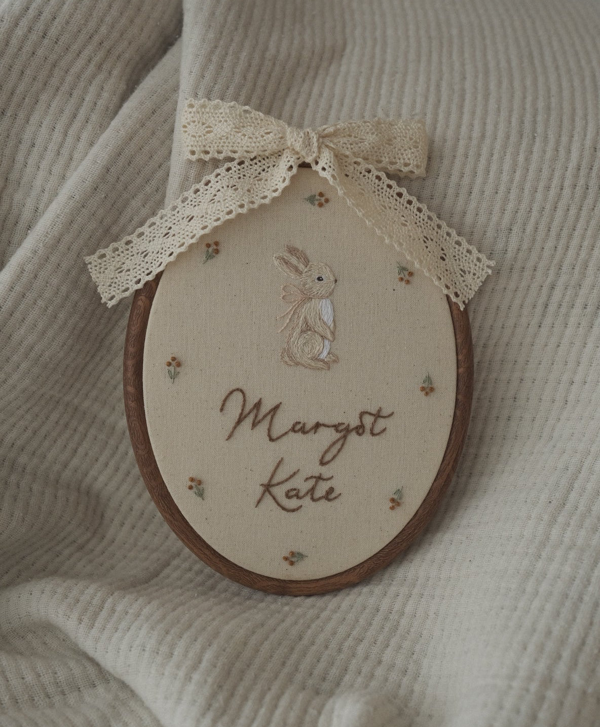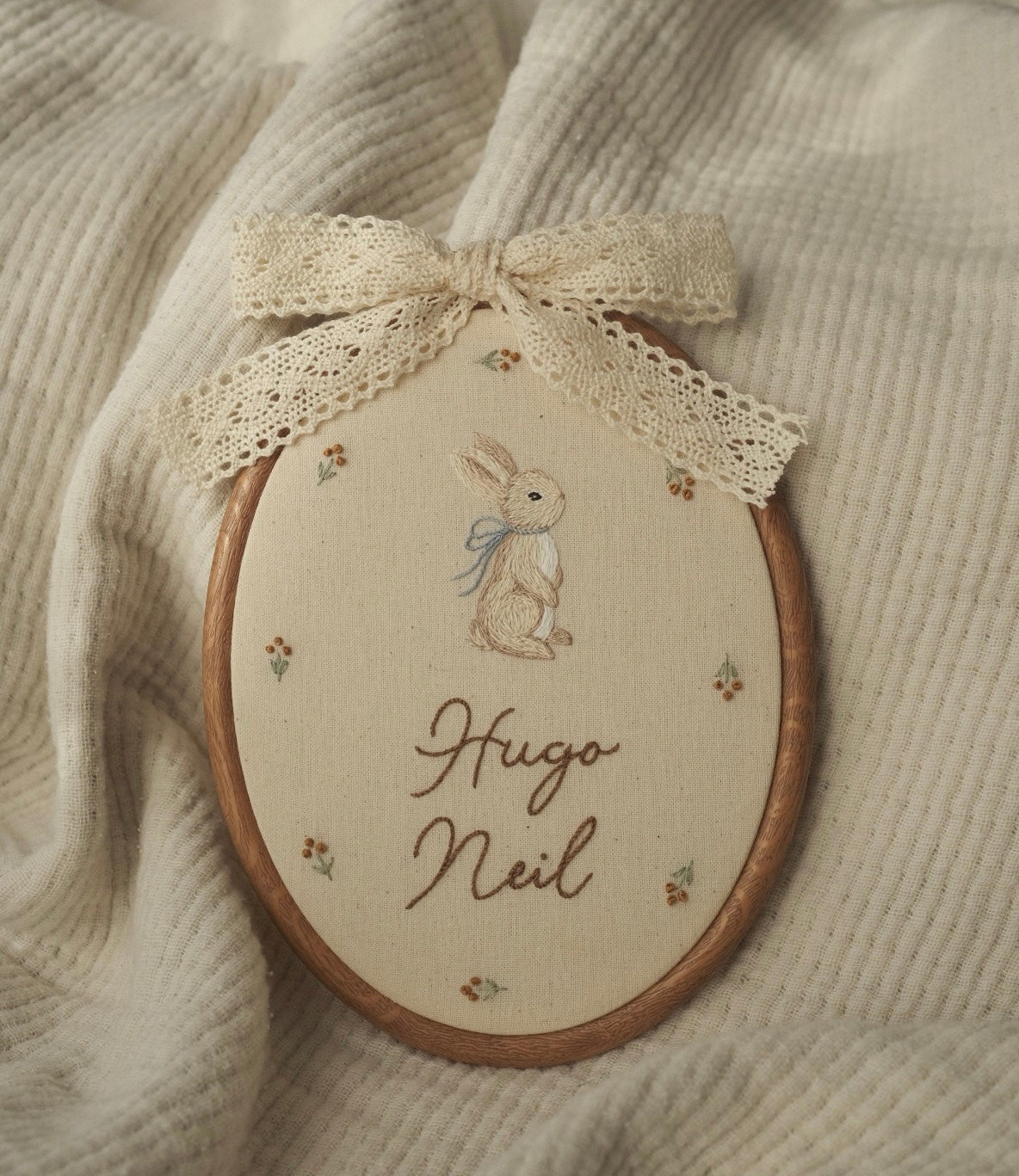Handmade in Australia and stitched in-house to create heirloom-quality pieces.This charming oval hoop embroidery showcases a whimsical bunny design, perfect for adding a touch of magic to any nursery or child’s room. Each piece is lovingly crafted by hand, ensuring every detail is unique and special.